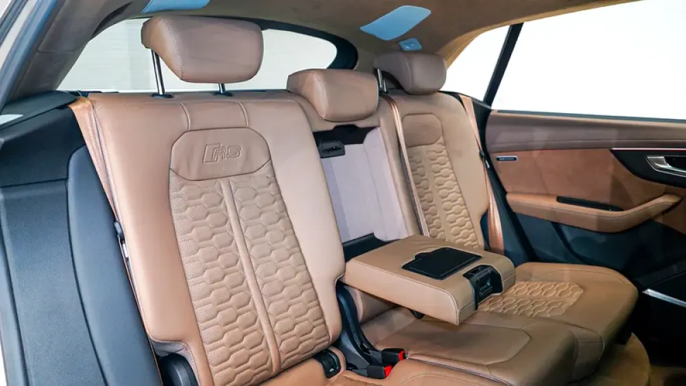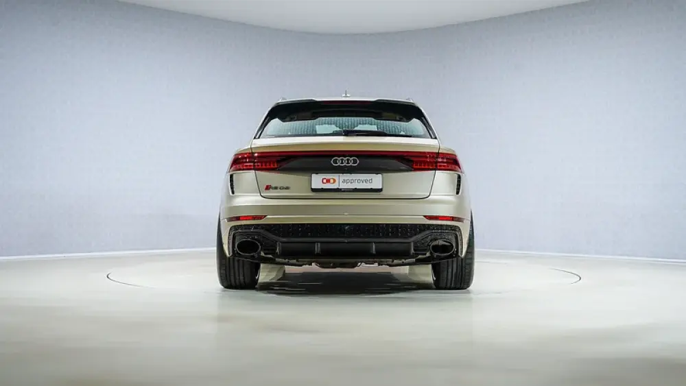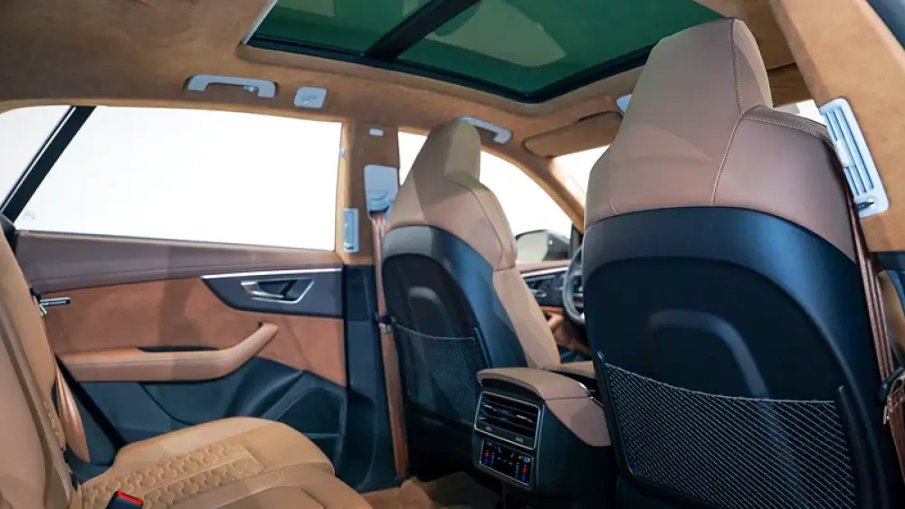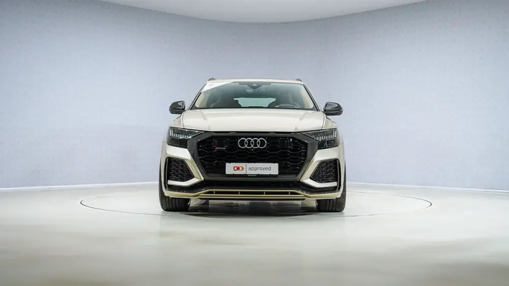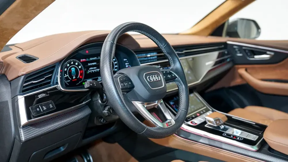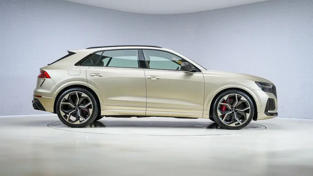 The 2022 Audi RS Q8 Carbon Exclusive Edition stands out as an Audi Exclusive model, featuring a rare Vicuna Beige exterior and a luxurious Cognac Exclusive interior. This bespoke color combination enhances the RSQ8’s aggressive stance, complemented by carbon fiber accents from the Carbon Edition package.