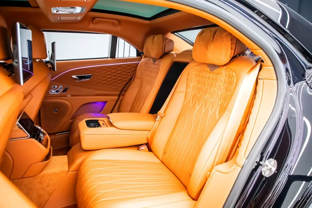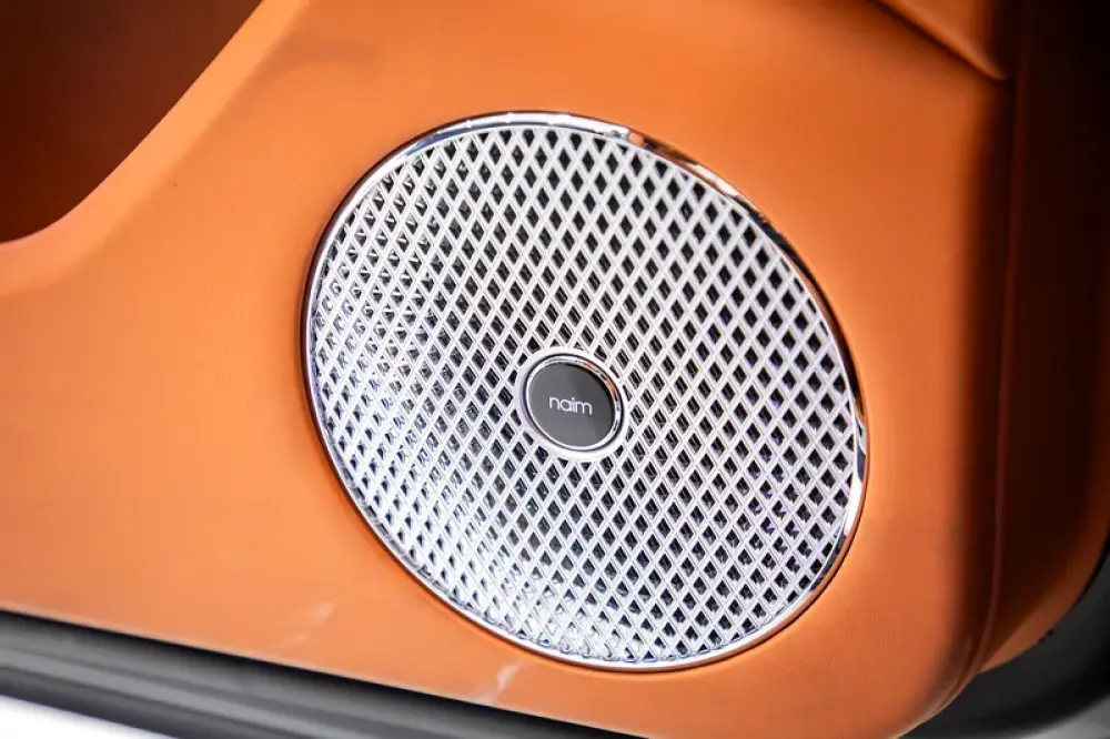 The Flying Spur is instantly recognisable as a handcrafted car, from its cut crystal-style jewelled headlamps and gloss black matrix grille to the polished chrome quad oval tailpipe finishers at the rear. The 20” five twin-spoke alloy wheels feature a silver-painted finish, while the hybrid car also displays a ‘Hybrid’ badge on the boot, plus ‘Hybrid’ treadplates.