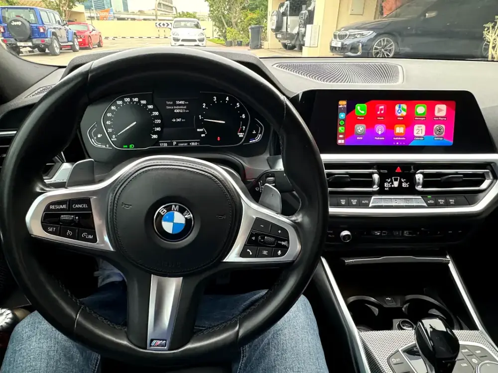 The M Sport package enhances both the appearance and driving feel of the car, featuring aggressive styling, sportier suspension tuning, and a driver-focused cabin with Alcantara sport seats that provide both comfort and grip during spirited driving.
