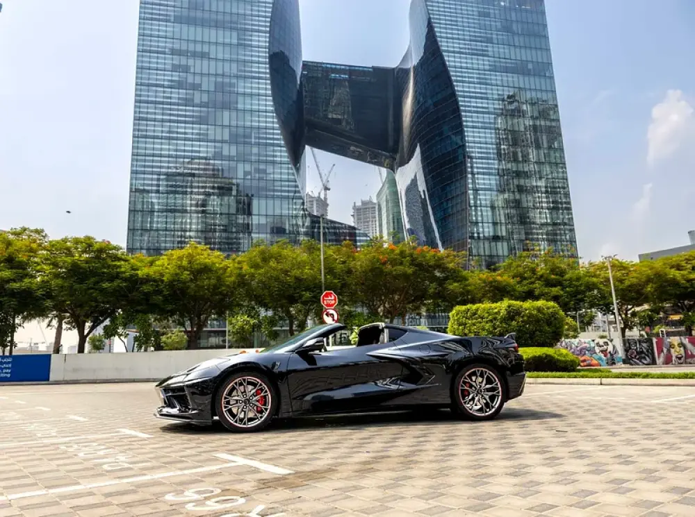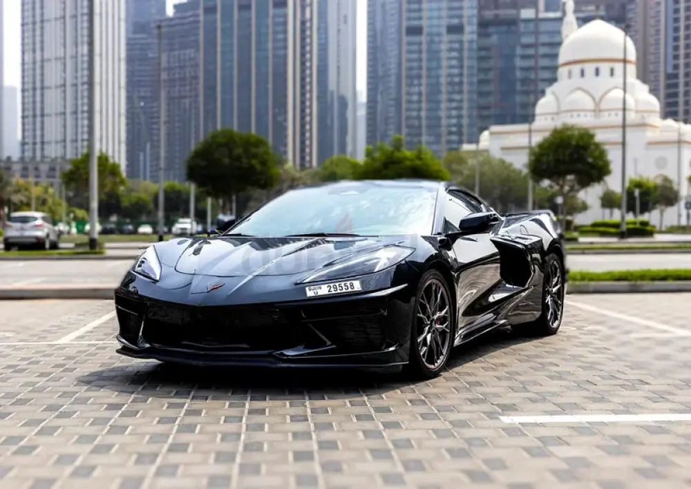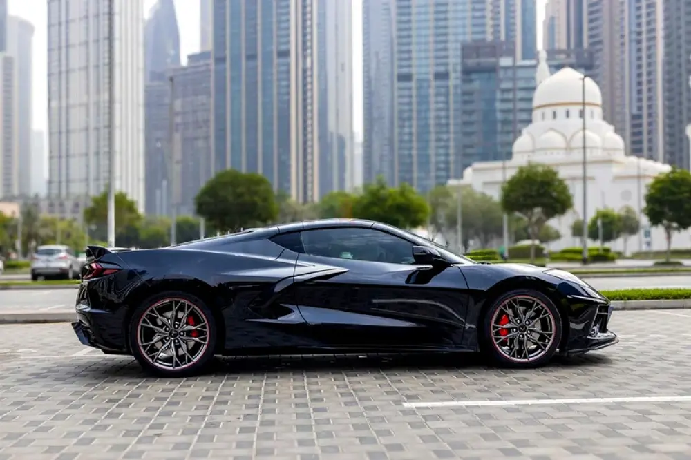 Available for rent is a 2024 Corvette Stingray 2LT, featuring a black exterior paired with a red leather interior. This high-performance sports car is equipped with a 6.2L V8 engine delivering 495 horsepower and an 8-speed dual-clutch transmission for smooth and responsive driving.