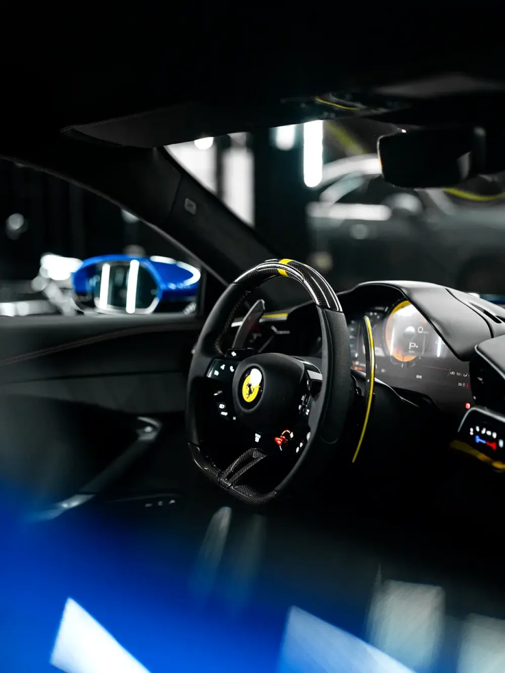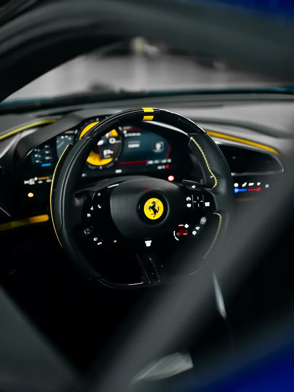 Signature Ferrari steering wheel with embedded controls for effortless operation while maintaining full control