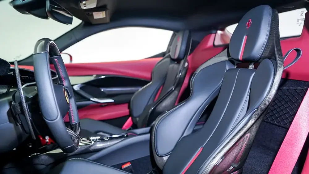 Beautifully configured with extensive carbon fibre options including diffuser, door panels, and instrument cluster trim, complemented by carbon fibre racing seats, matte diamond-polished forged wheels, and the Cavallino stitched in Bordeaux on the headrests. The cabin features Nero and Bordeaux dual-tone leather with coloured inner details and stitching, adding a rich sense of contrast and exclusivity.