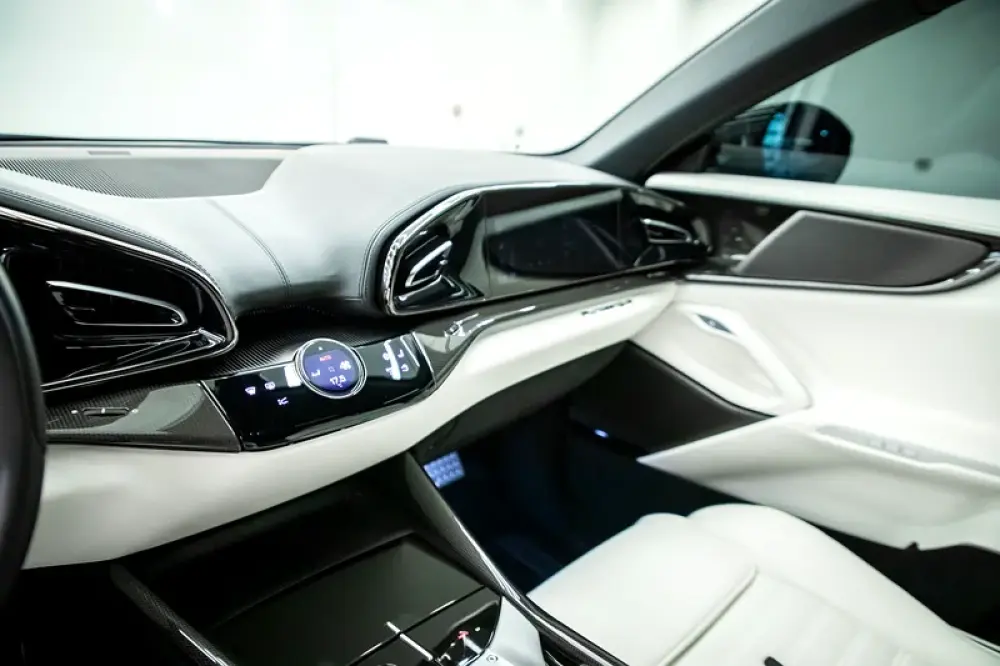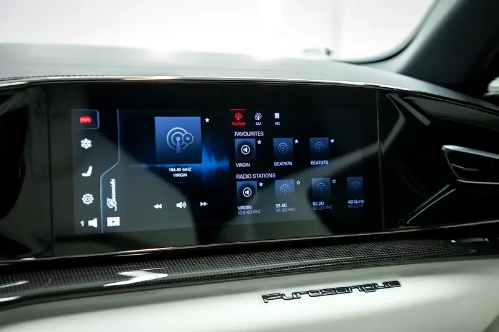 The Purosangue features a unique suspension system with continuous, wheel-selective damping, minimizing body roll and improving stability. It includes a passenger display for added interaction and a spacious, luxurious interior with individual rear seats and a large cargo area.