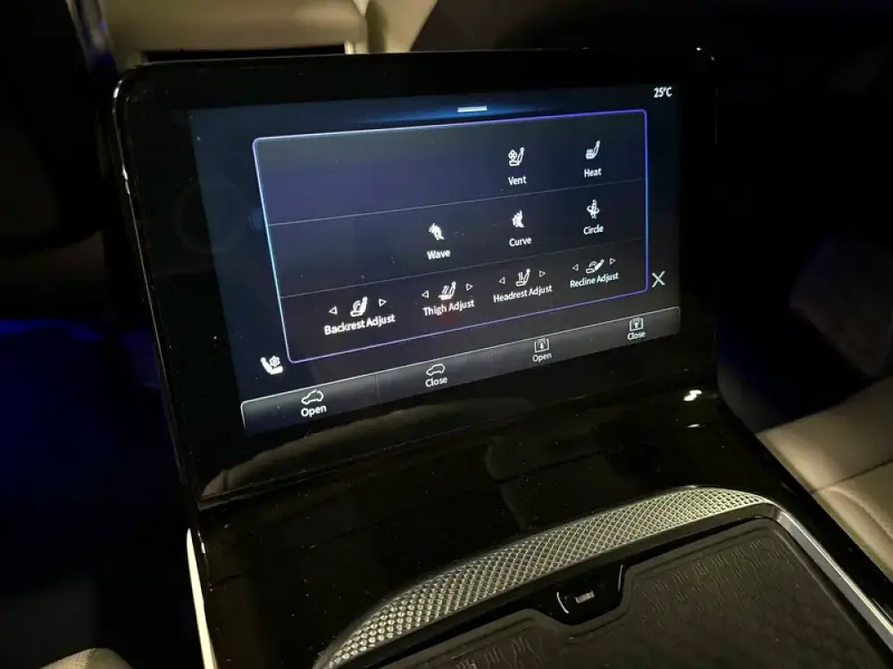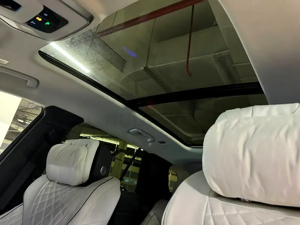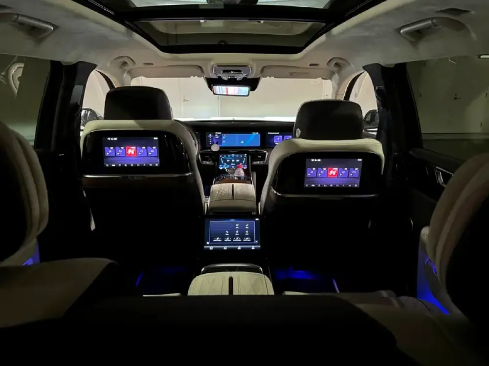 Flagship full-size EV in the true 2+2 executive lounge layout. Both rows are individual power captain’s chairs with extendable ottomans, ventilation, heating and massage under a sweeping panoramic glass roof—built for chauffeured comfort and VIP travel.