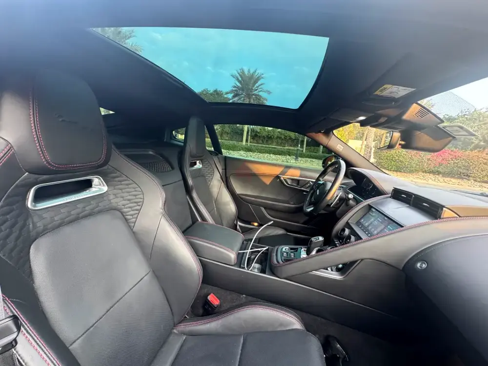 • Black leather interior with red stitching
