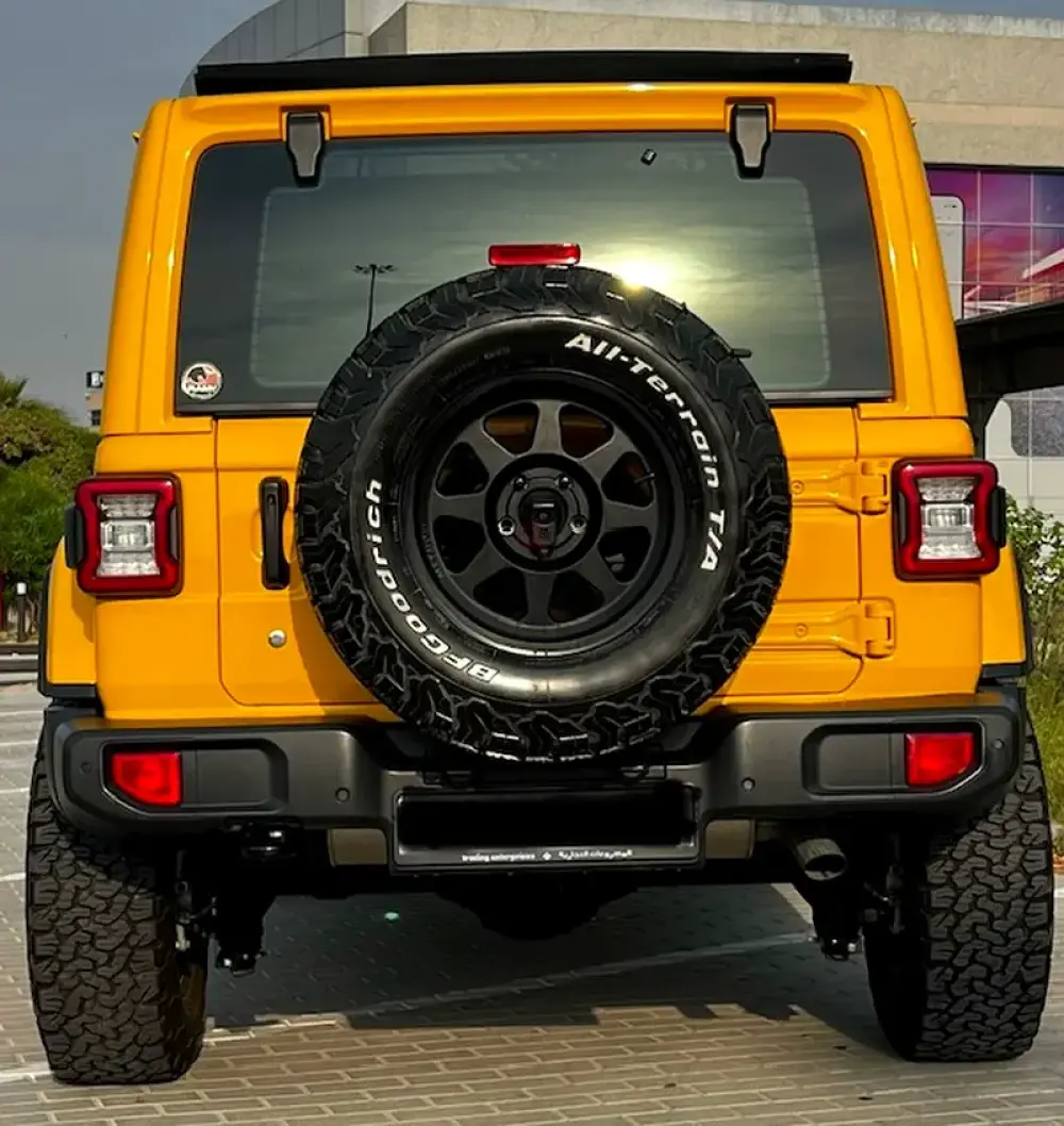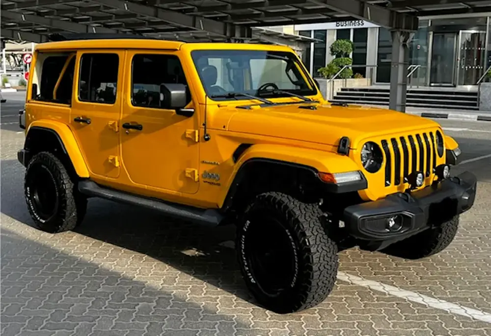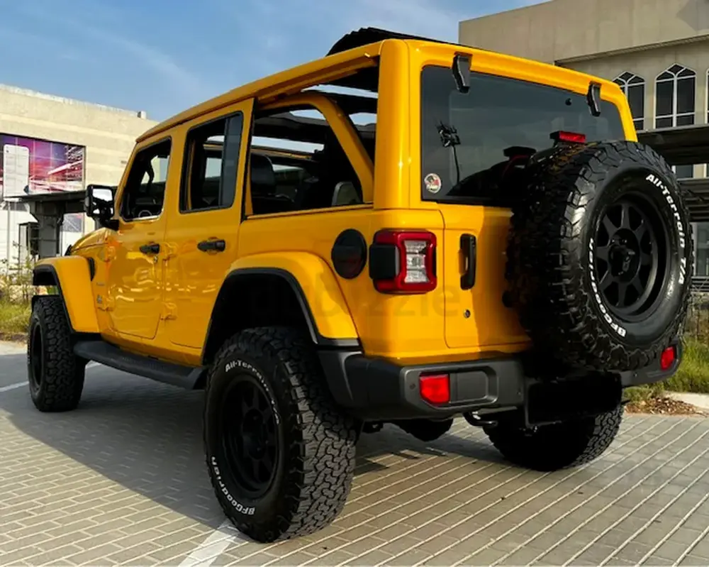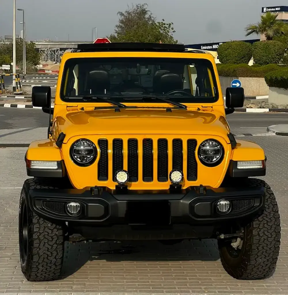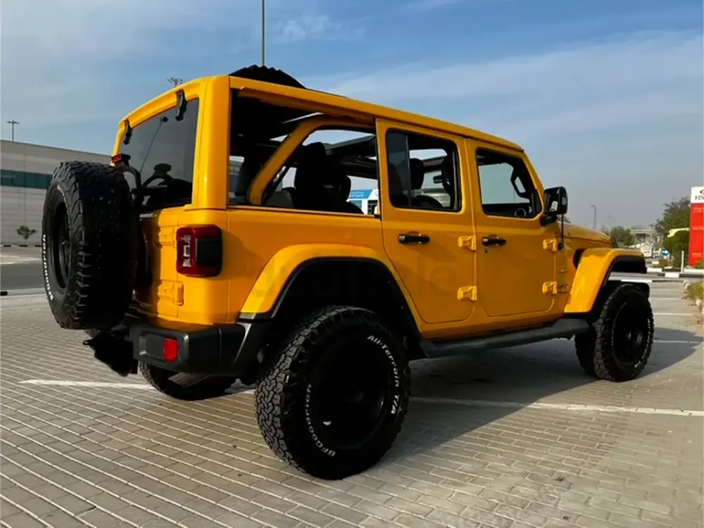 Low Mileage, Jeep Wrangler Sahara Unlimited with One-Touch Power Top, 'burnt' yellow exterior colour, black leather interior, tinted side and rear windows, raised suspension with LT285-70R17 BF Goodrich All Terrain Tyres, insulated sliding roof, additional front spotlights, 8-speed automatic transmission, adaptive Cruise Control, removable rear quarter lights, rear window heater and wiper/washer system, Touchscreen with Uconnect and 4C navigation, Apple CarPlay, Premier Sound System, remote proximity keyless entry, all-weather floor mats in seating areas, Parksense rear park assist system, ParkView rear back-up camera system, Blind Spot monitoring