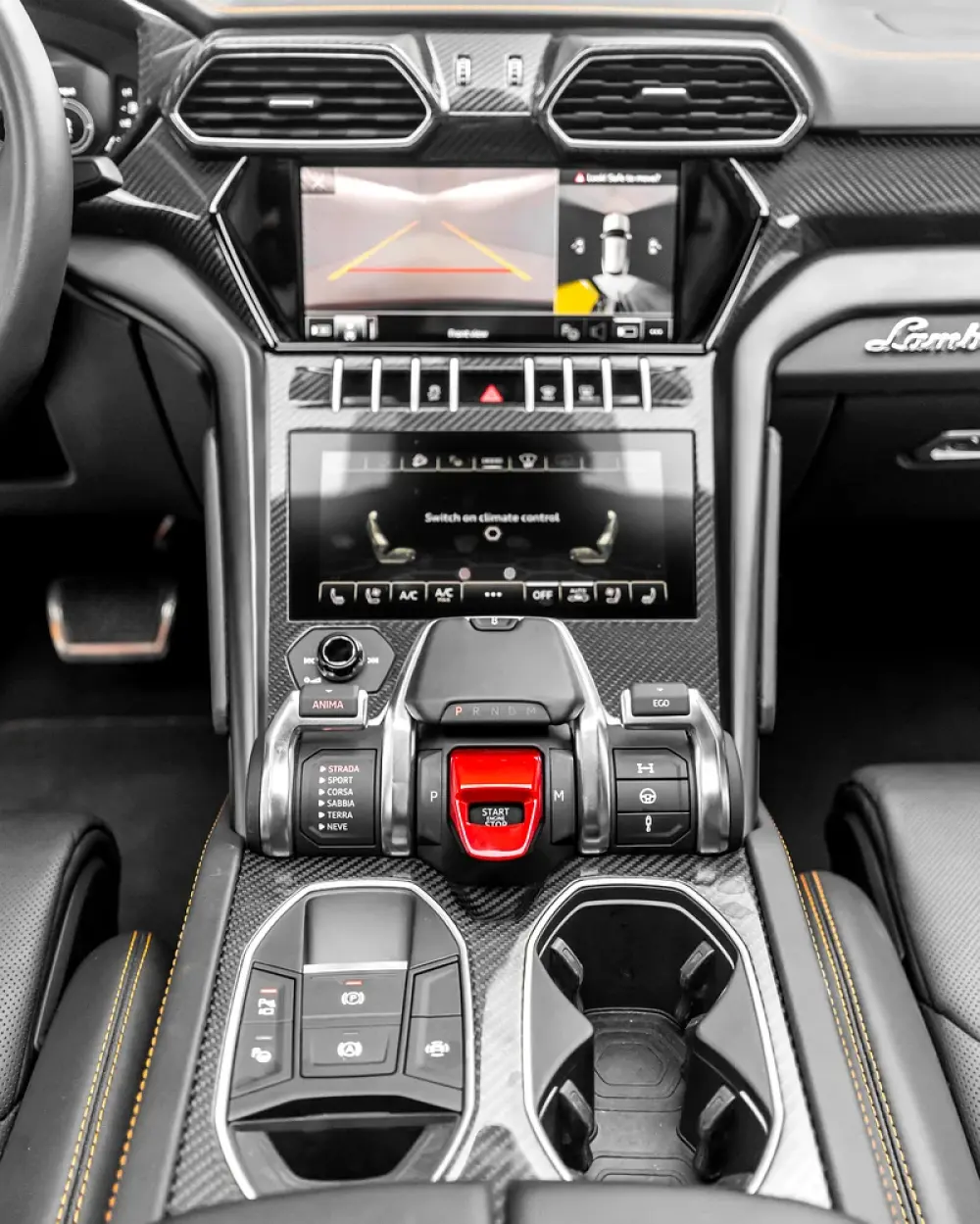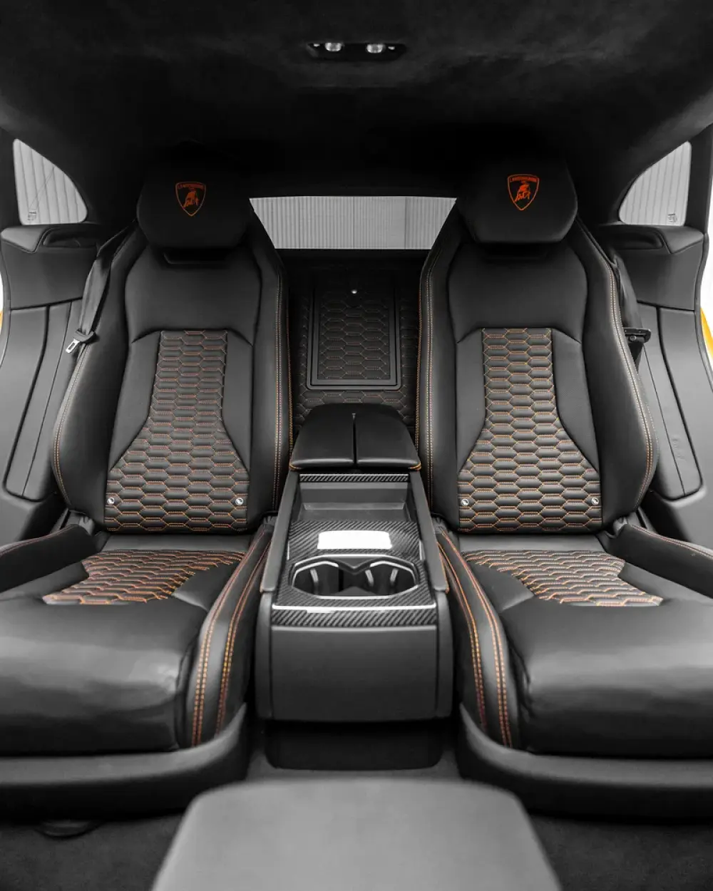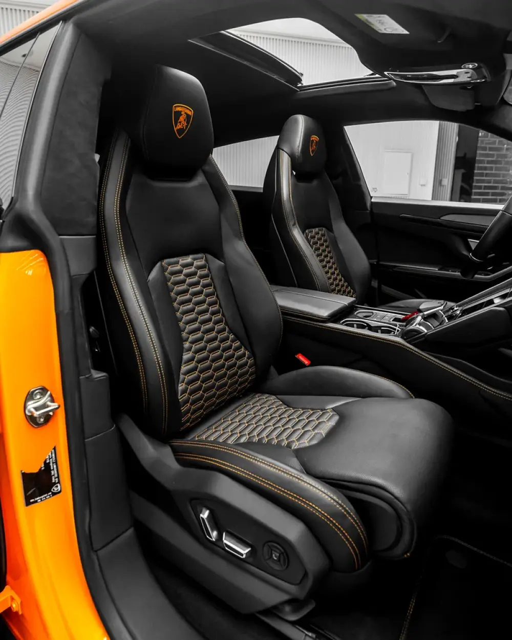 -Front comfort seats, fully electric (multi-way adjust) with embroidered Lamborghini shields in orange