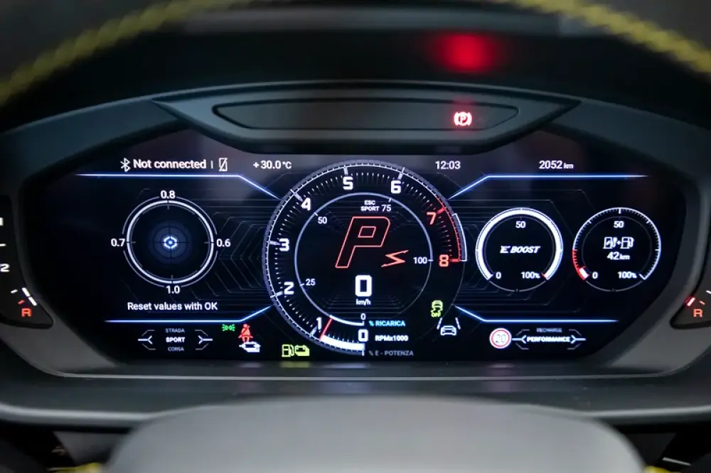 • Hybrid System: The electric motor is positioned between the engine and transmission, and the vehicle has various driving modes including electric, hybrid, and performance modes.