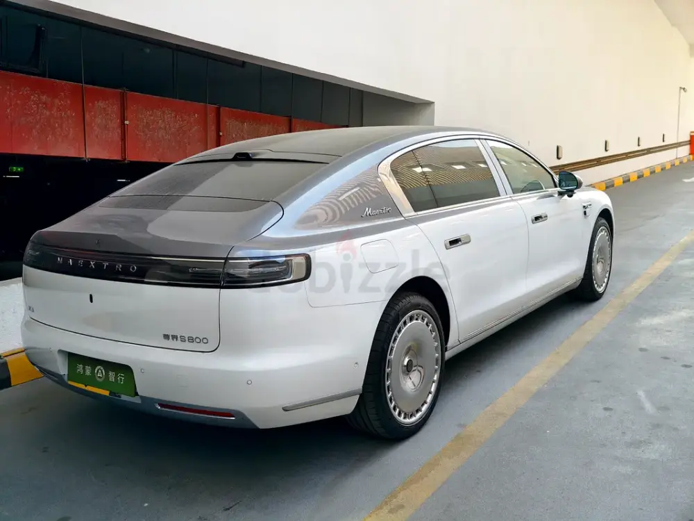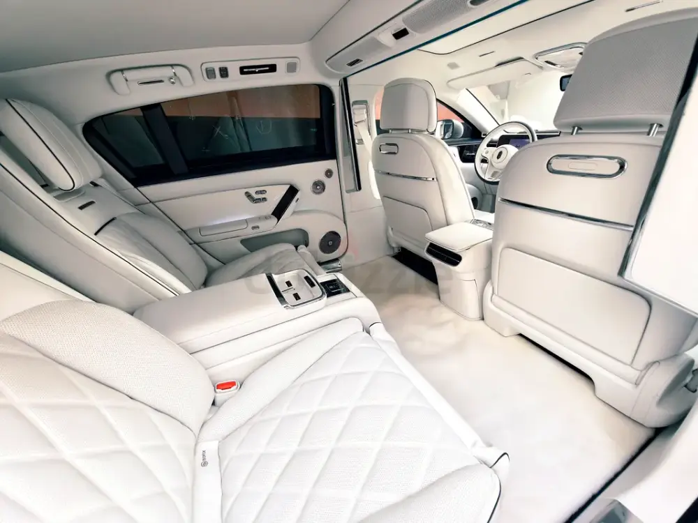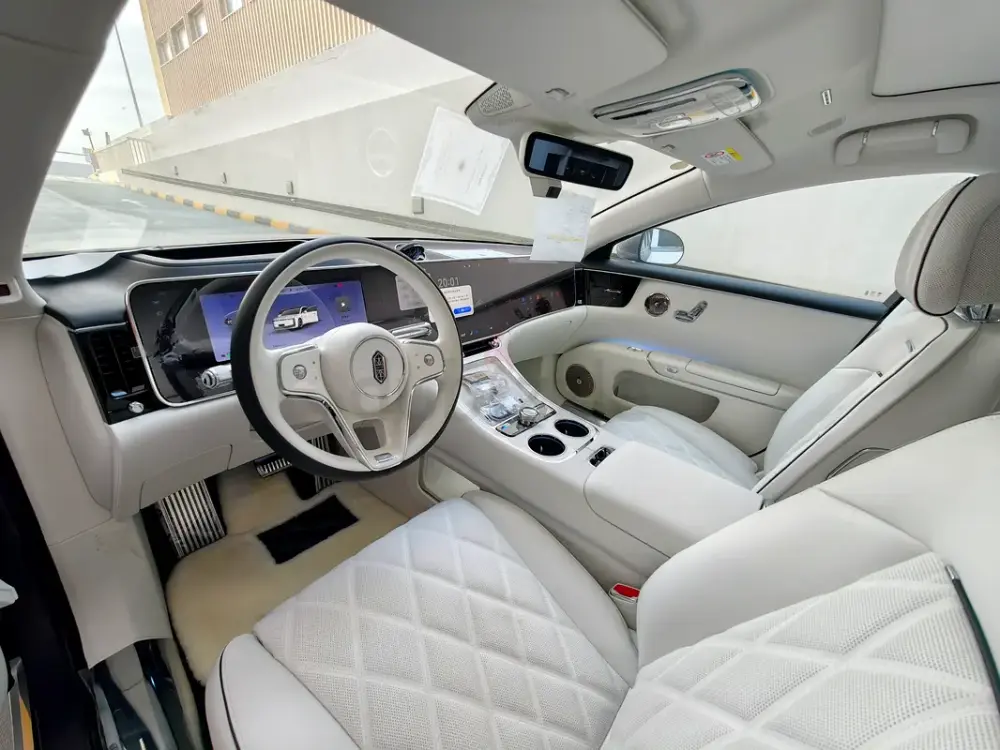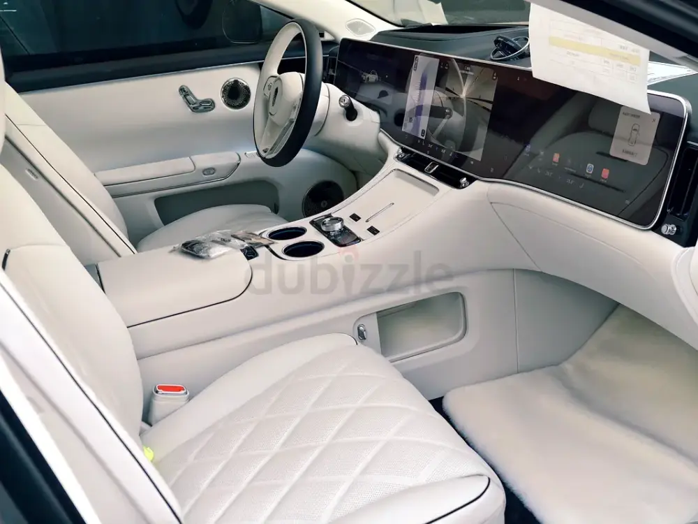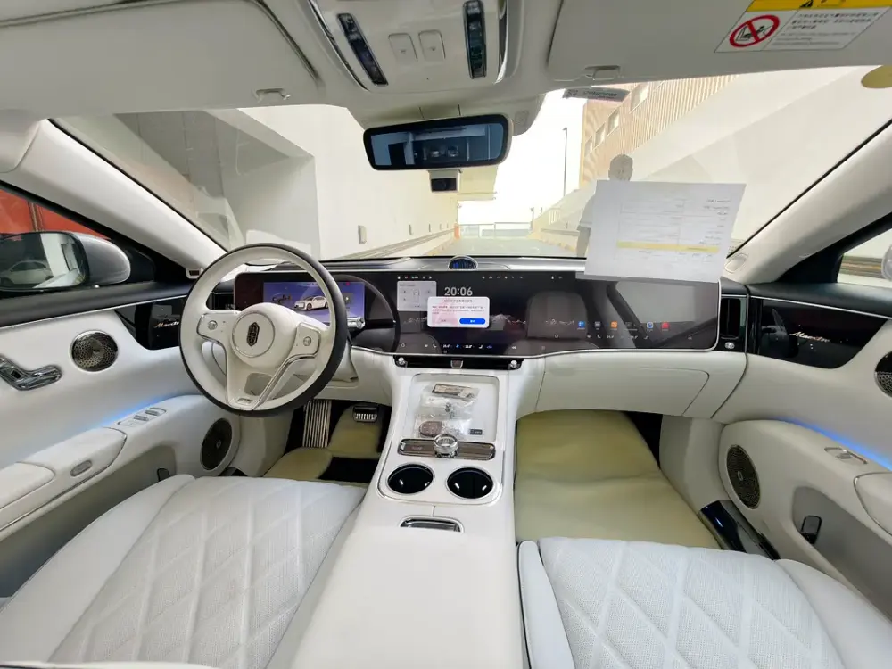 Triple-motor AWD with a range extender, offering up to 1,200 km of range. Over 800 hp, four-seat luxury layout, 43-speaker sound system, starlight headliner, 21-inch aero wheels, projection screen, and electrochromic glass. Grey and white two-tone exterior with an all-white interior. Fully loaded — the absolute top-spec configuration.