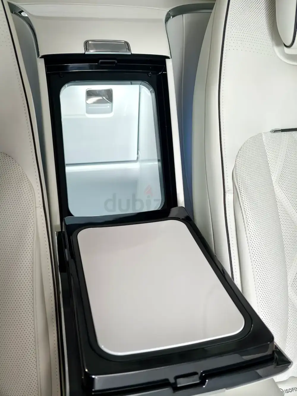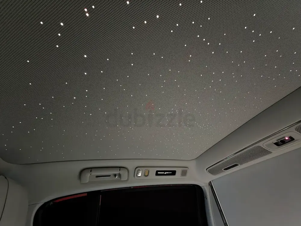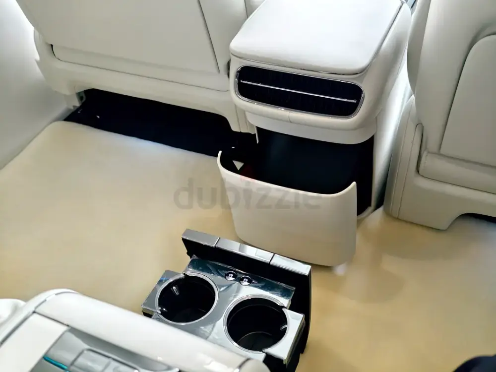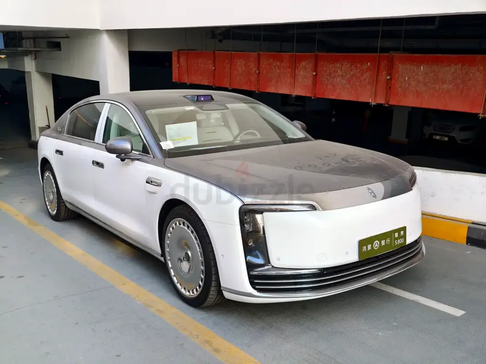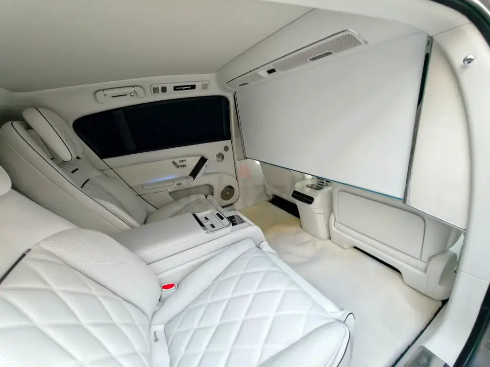Triple-motor AWD with a range extender, offering up to 1,200 km of range. Over 800 hp, four-seat luxury layout, 43-speaker sound system, starlight headliner, 21-inch aero wheels, projection screen, and electrochromic glass. Grey and white two-tone exterior with an all-white interior. Fully loaded — the absolute top-spec configuration.