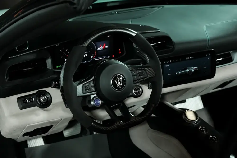 the cabin of the PrimaSerie Edition is upholstered in Ice leather and Alcantara with Acquamarina stitching and trident headrest embroideries as well as a special multicolor seat backing. The Interior Carbon Fiber Package includes a carbon fiber instrument cluster cap, column-mounted paddle shifters, and door sills. Other features include heated and power-adjustable front seats, an electric steering column, a frameless digital rearview mirror, an aluminum footrest, remote start, keyless entry, dual-zone automatic climate control, a full digital instrument cluster, a 12-speaker Sonus Faber sound system, and a 10.25” touchscreen infotainment system with navigation, Apple CarPlay, and Android Auto.