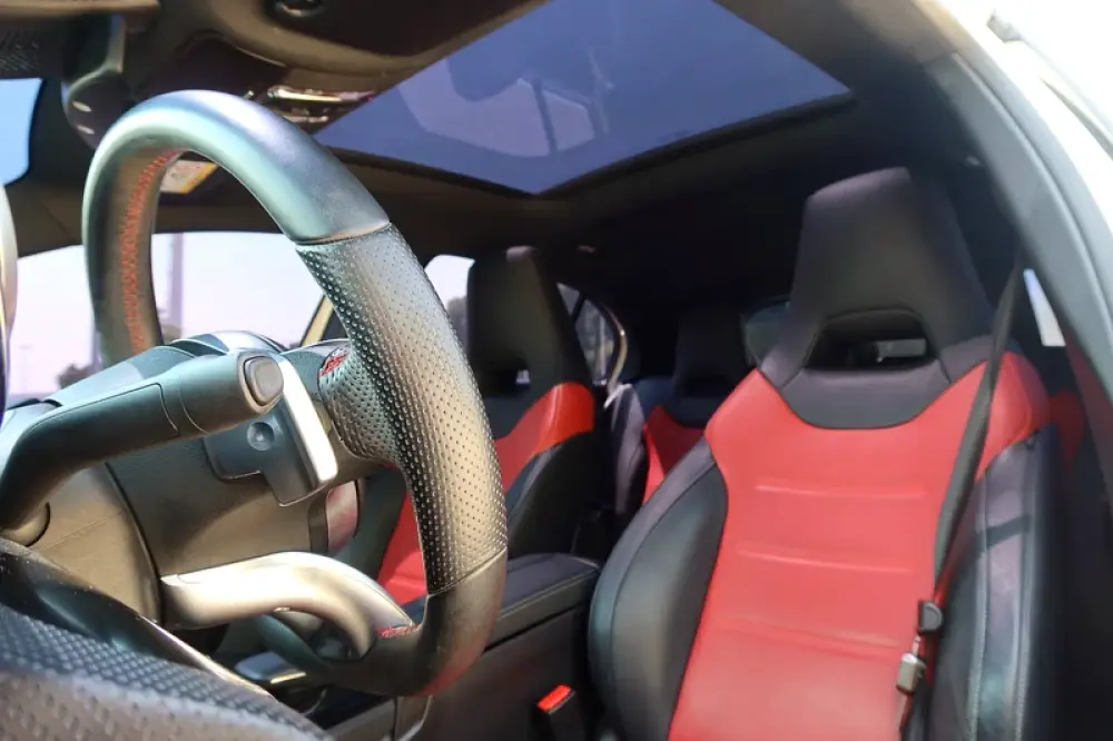 • Premium AMG sport seats in black/red leather, flat-bottom steering wheel