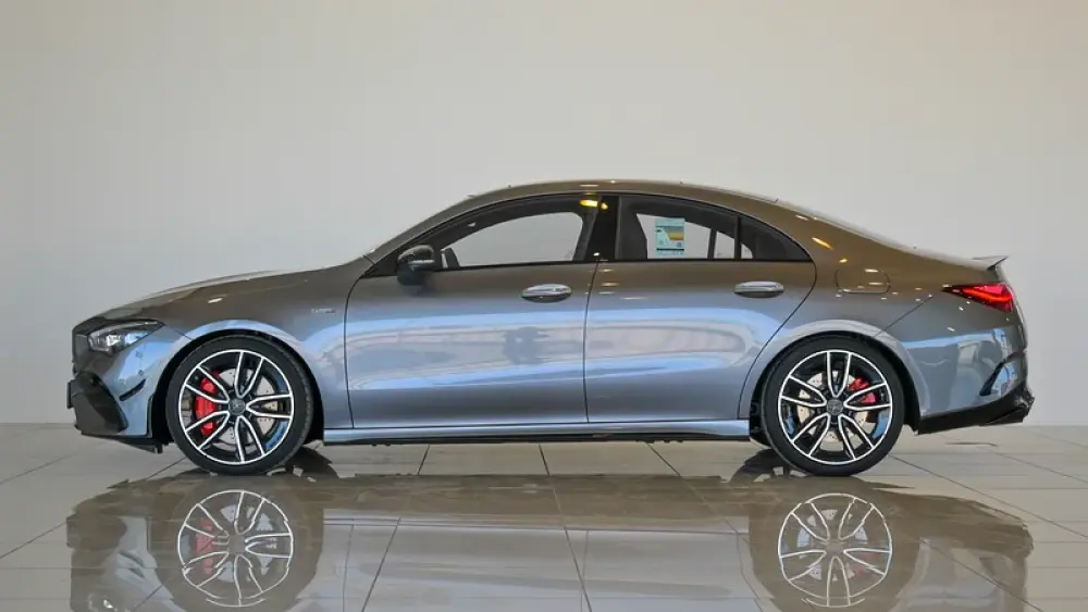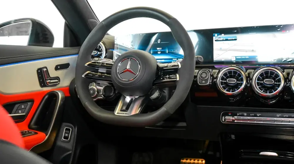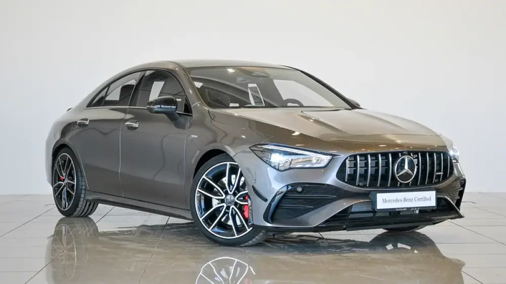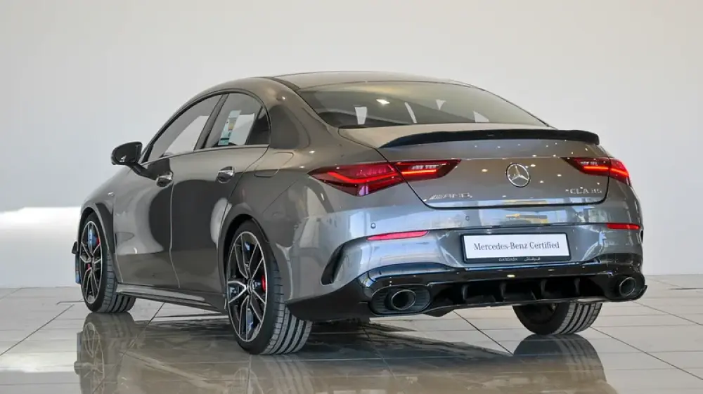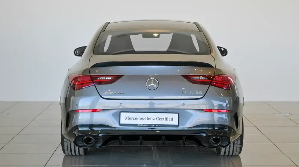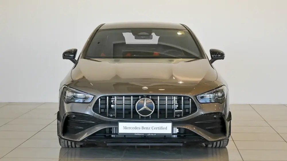 Pre owned Mercedes-Benz CLA 35 4Matic AMG for sale in Dubai by Gargash Enterprises LLC. 4 cylinder engine, Grey exterior and automatic transmission. Comes with 19″ wheels and Red and Black interior. 48 kilometers on the odometer, GCC specs.