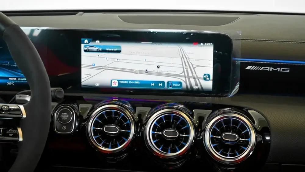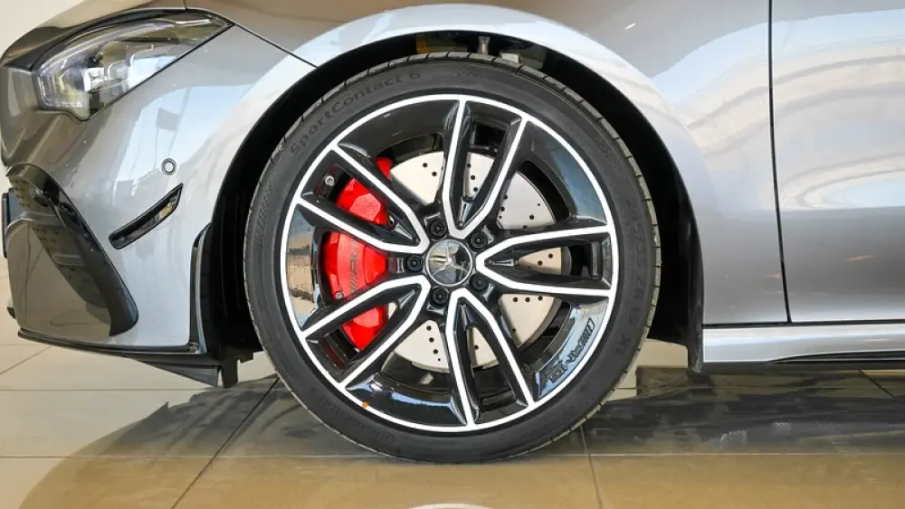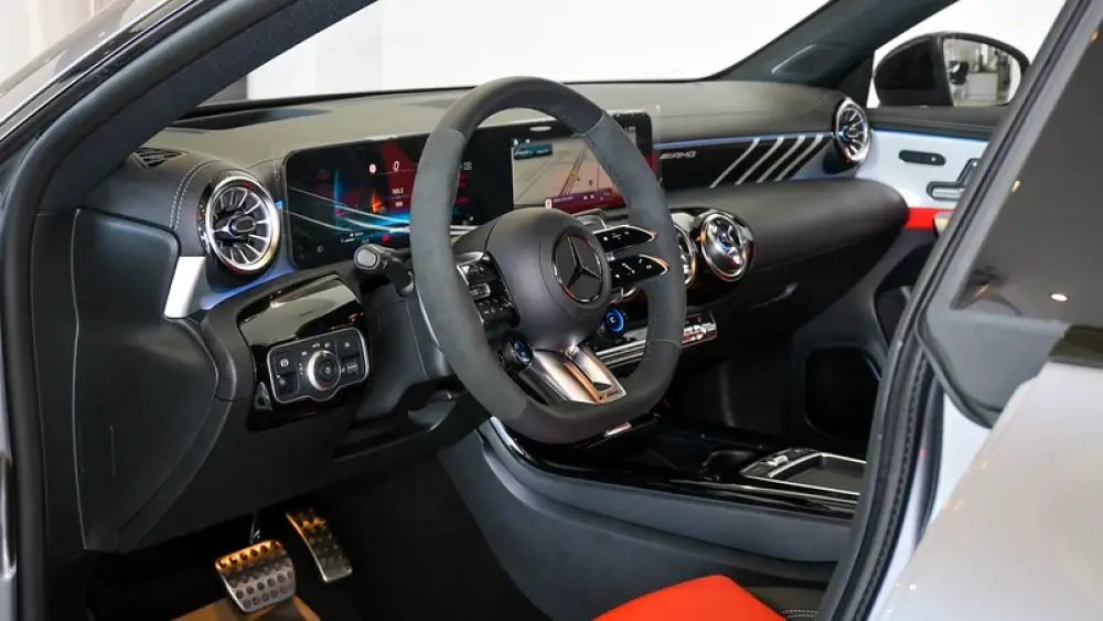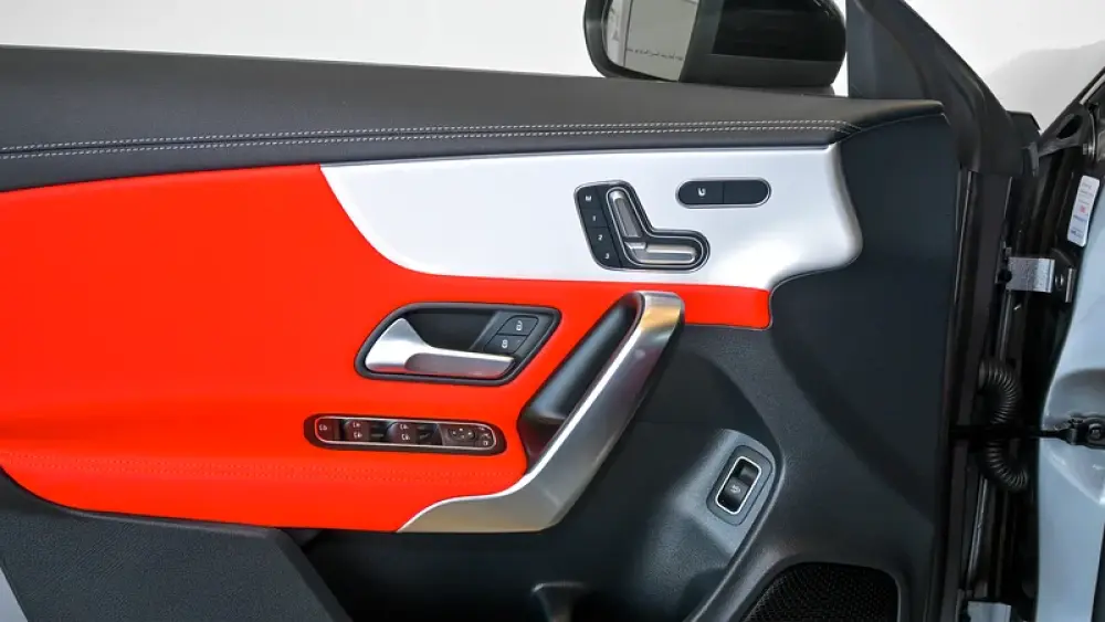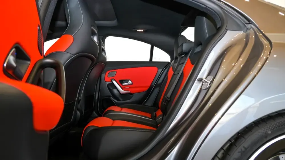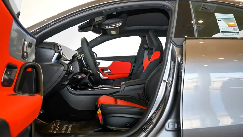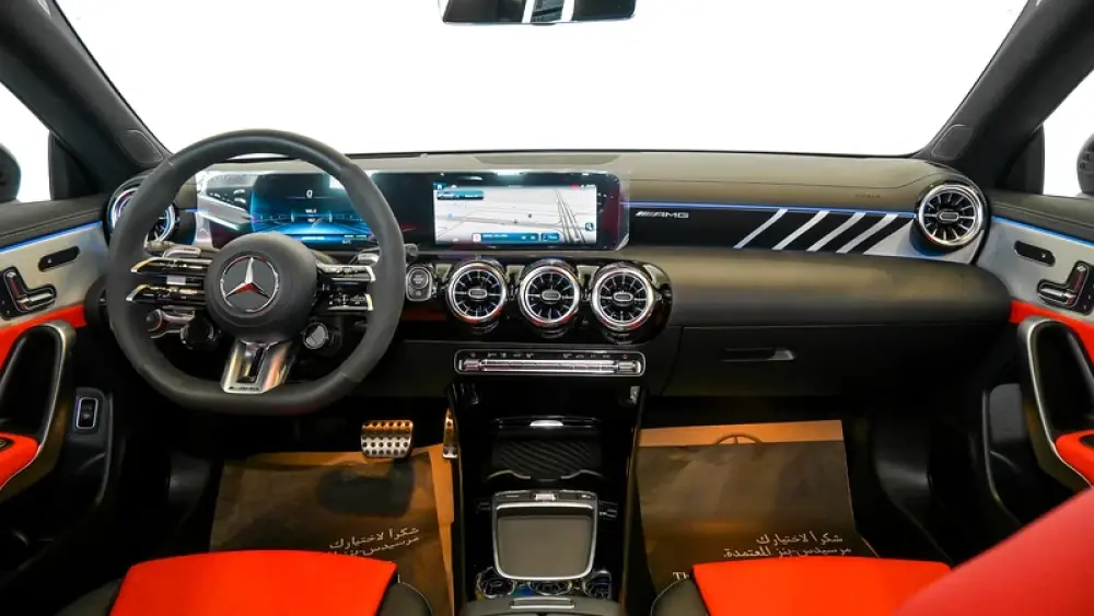 Pre owned Mercedes-Benz CLA 35 4Matic AMG for sale in Dubai by Gargash Enterprises LLC. 4 cylinder engine, Grey exterior and automatic transmission. Comes with 19″ wheels and Red and Black interior. 48 kilometers on the odometer, GCC specs.