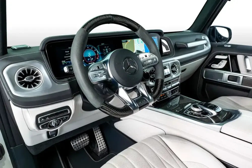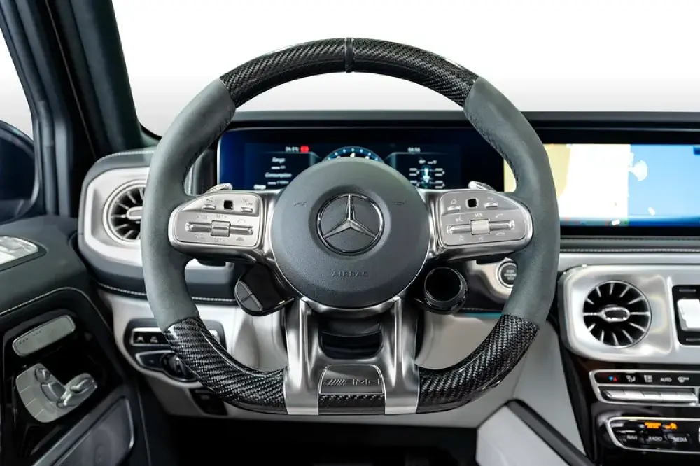 Step inside to a world of luxury with Platinum White Nappa Leather Seats, complemented by a two-tone dashboard and ambient lighting. Every detail is meticulously designed, from the stainless steel door sills to the carbon fiber AMG steering wheel.