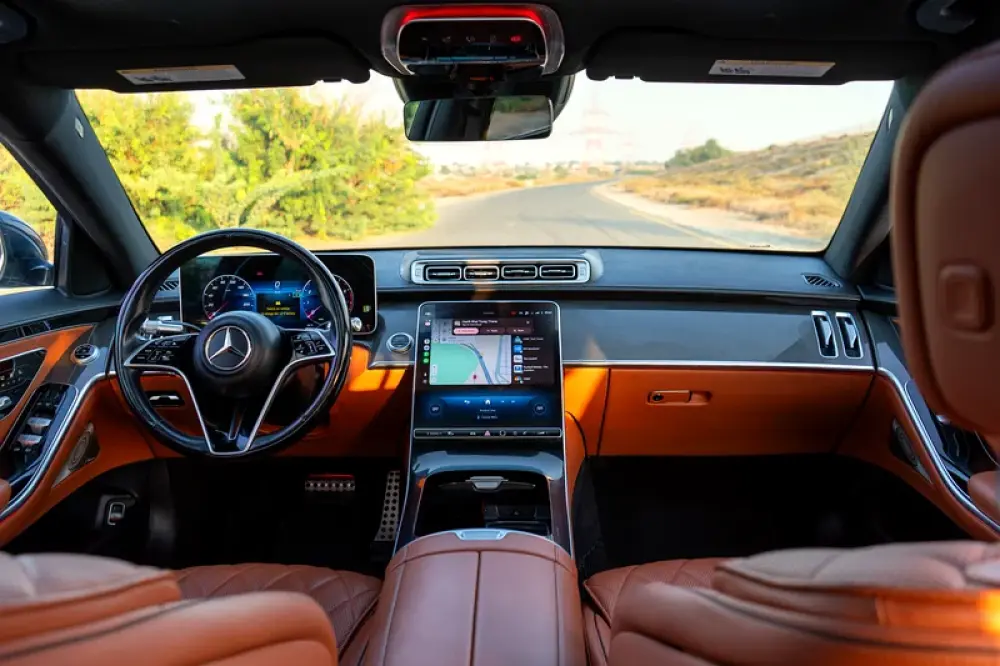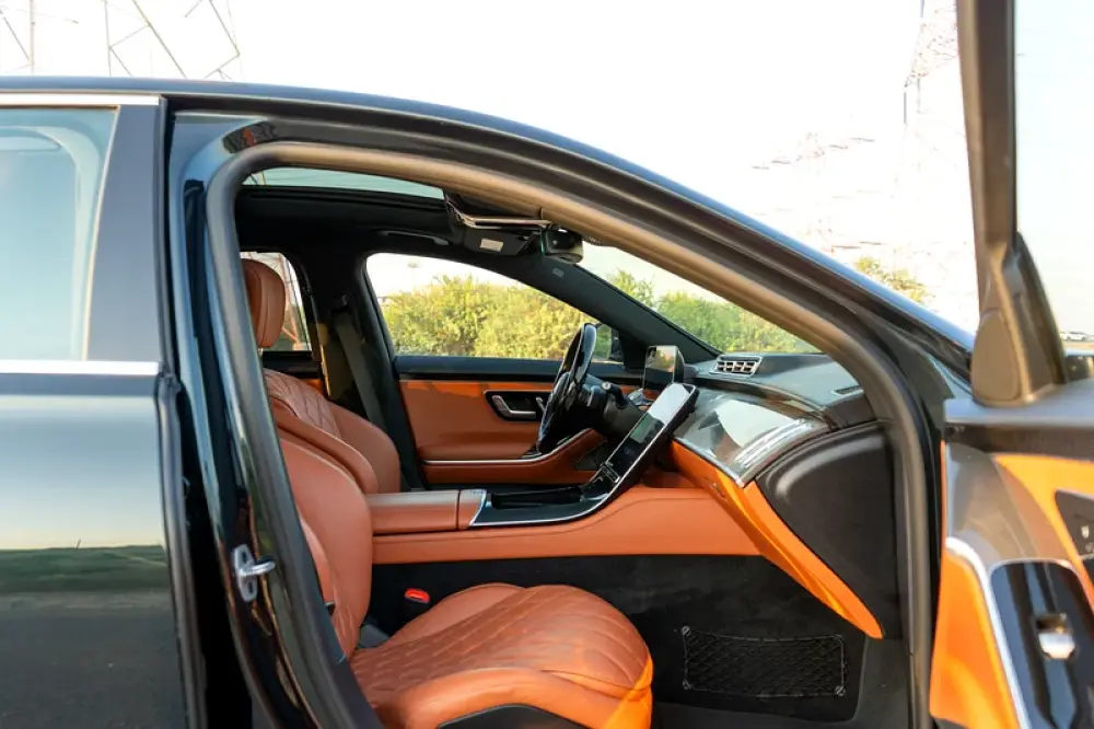 The interior features rich tan Nappa leather, ambient lighting, Burmester 4D sound, panoramic sunroof, and rear executive seats for unmatched comfort.