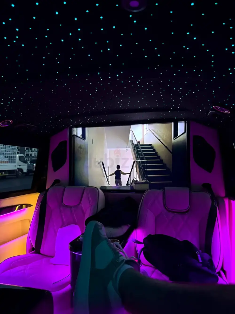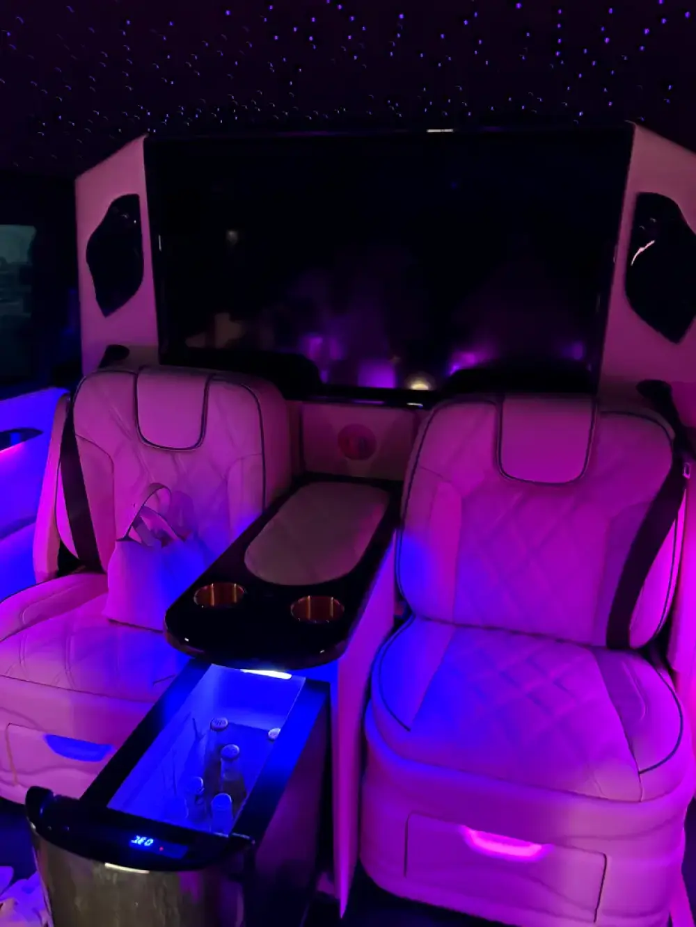 This V-Class has been engineered to be the ultimate mobile lounge and office. The seating arrangement features a regal king and queen seat configuration, offering unparalleled comfort for discerning passengers. For entertainment, a stunning 42-inch retractable television descends from the ceiling, paired with a PlayStation console and onboard WiFi for endless gaming and streaming possibilities.