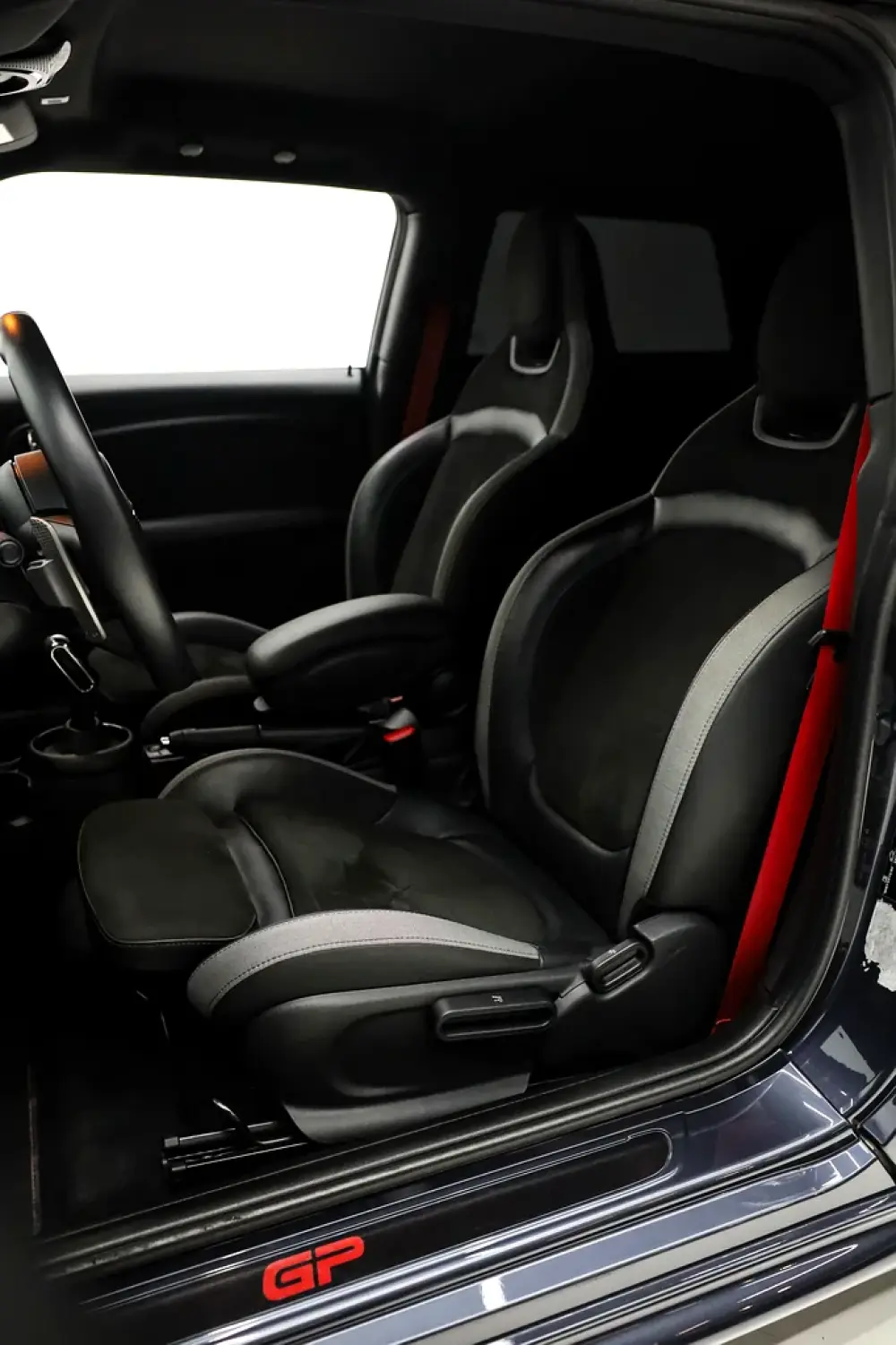 - **JCW Bucket Seats:** Black leather/alcantara with GP stitching, carbon shell backs, and 12-way adjustability.
