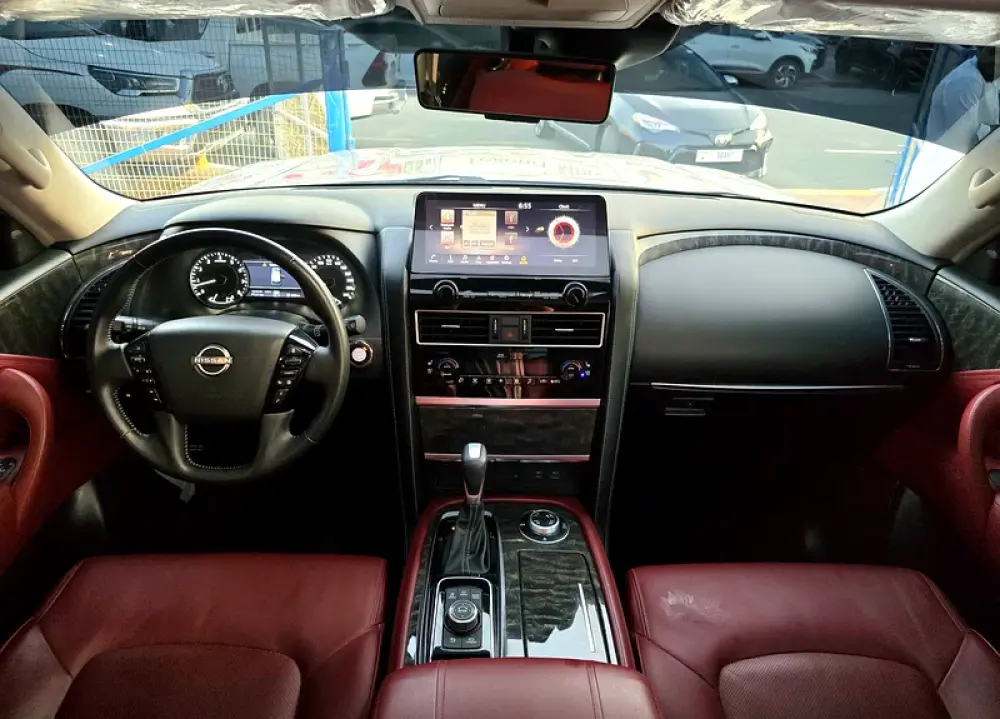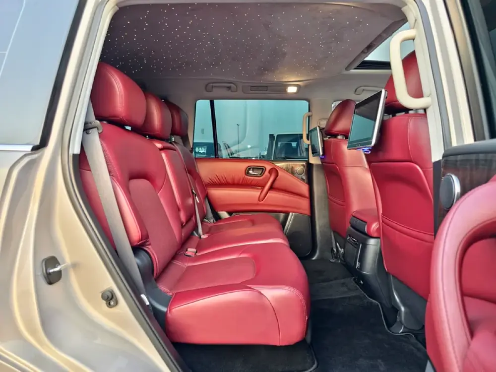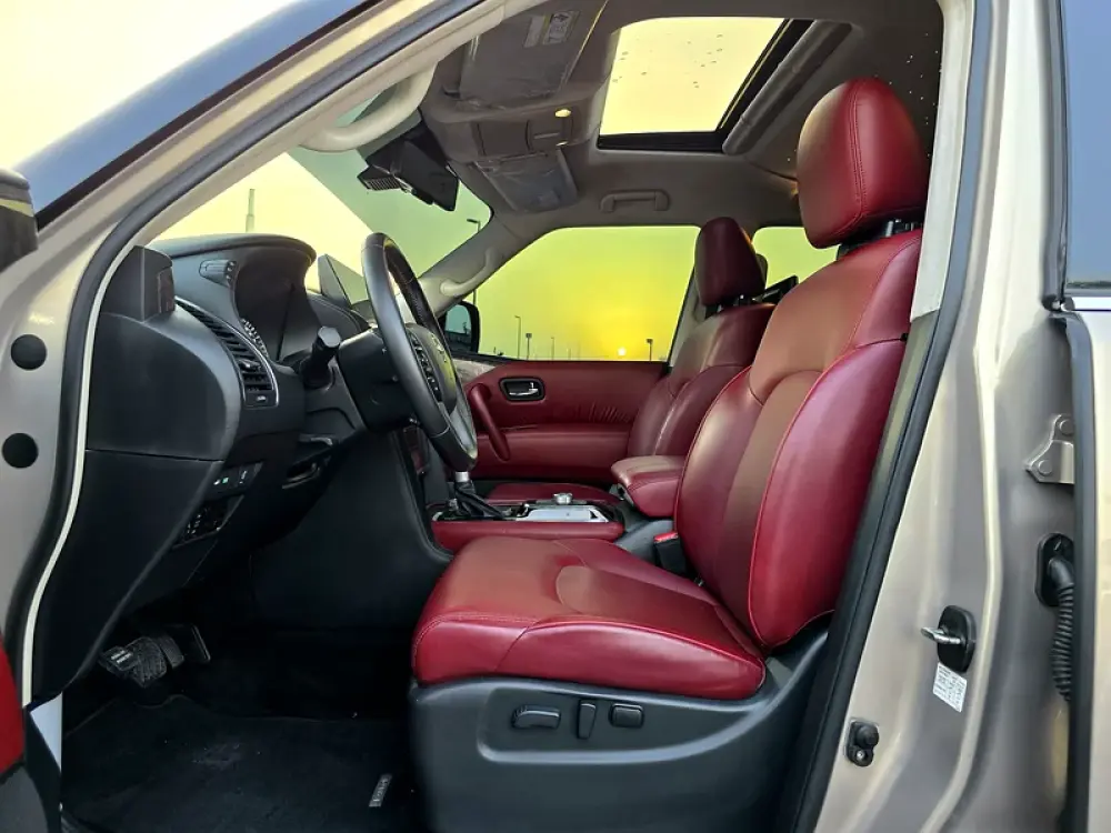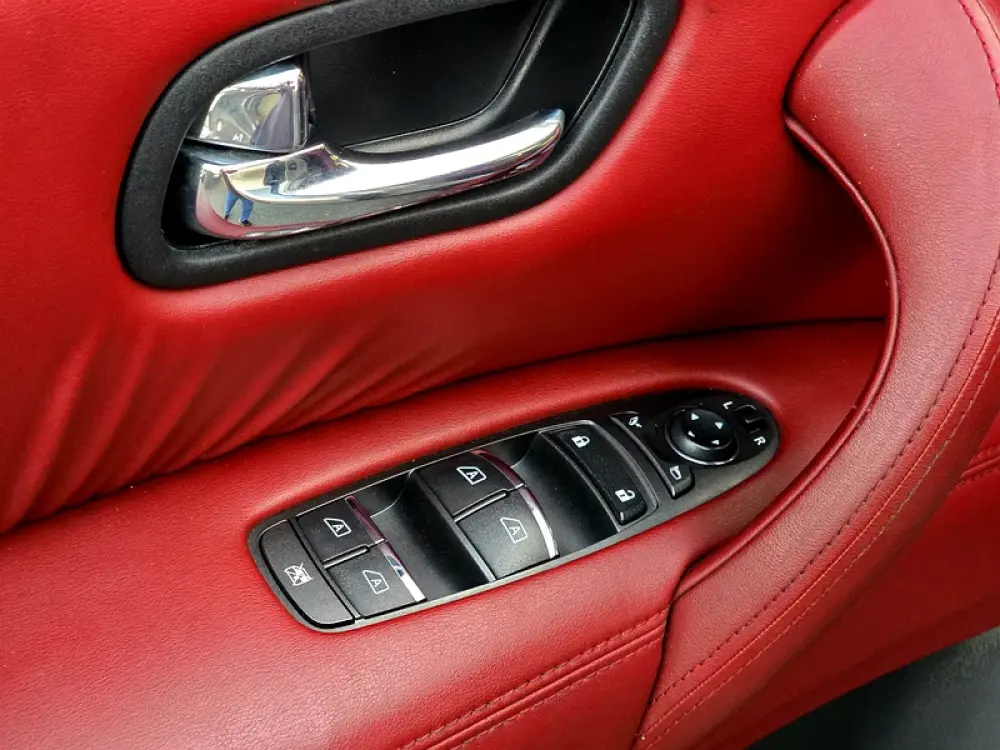 11. Interior upholstery: Quilted burgundy leather seats