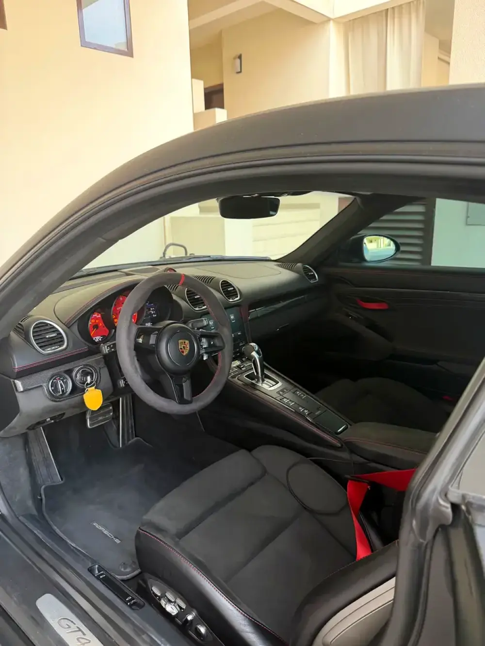 It has black interior with leather an alacantara details and steering wheel. Red stitching and belts with sports chrono pack and carbon trims.
