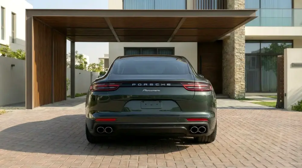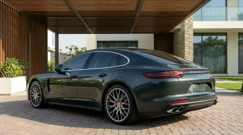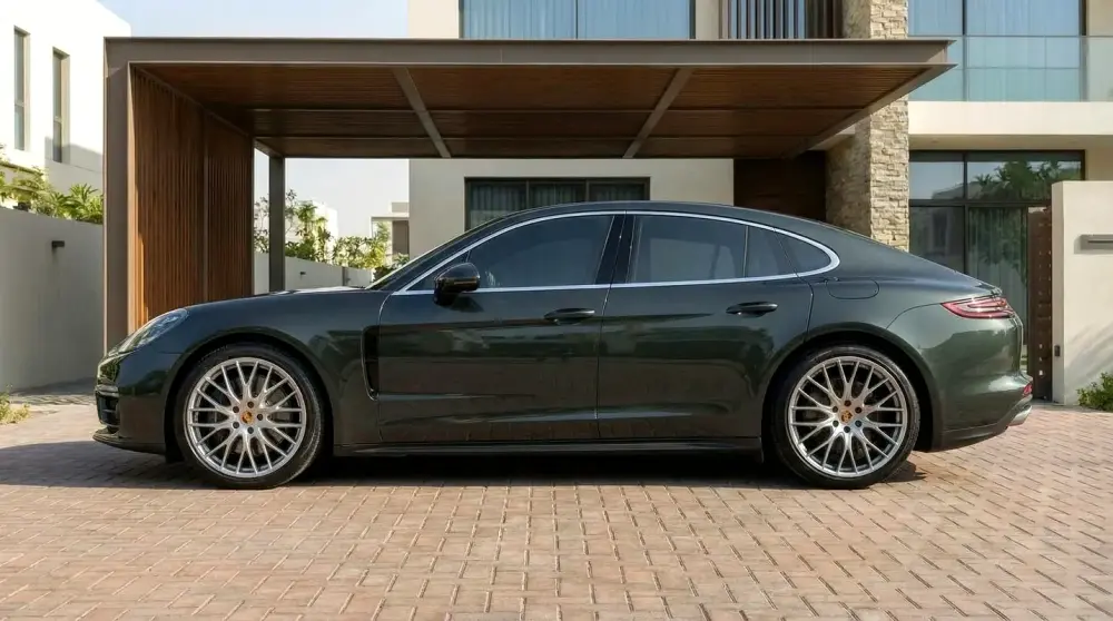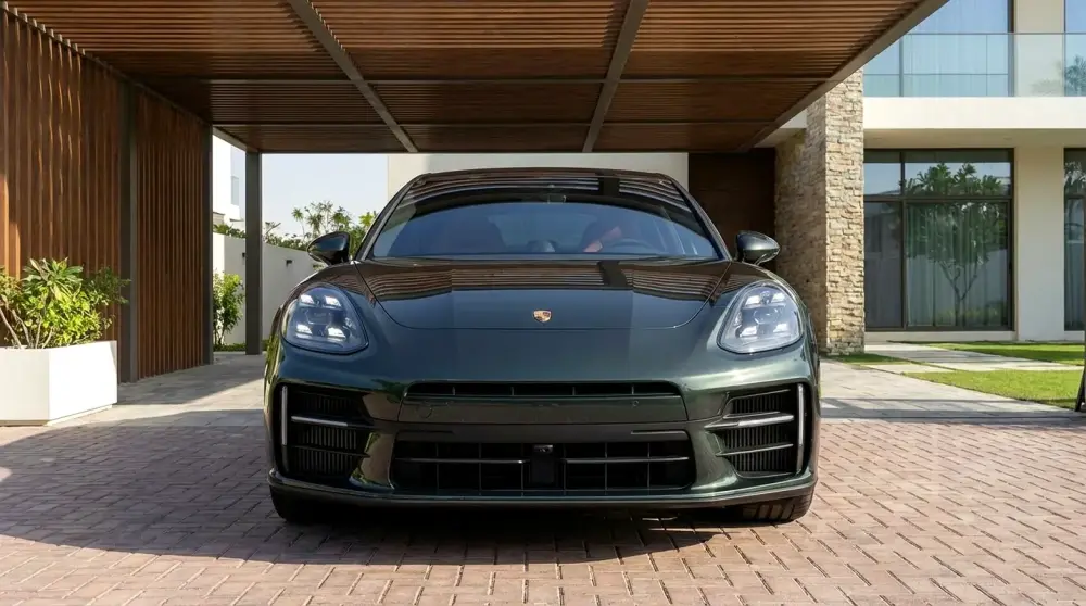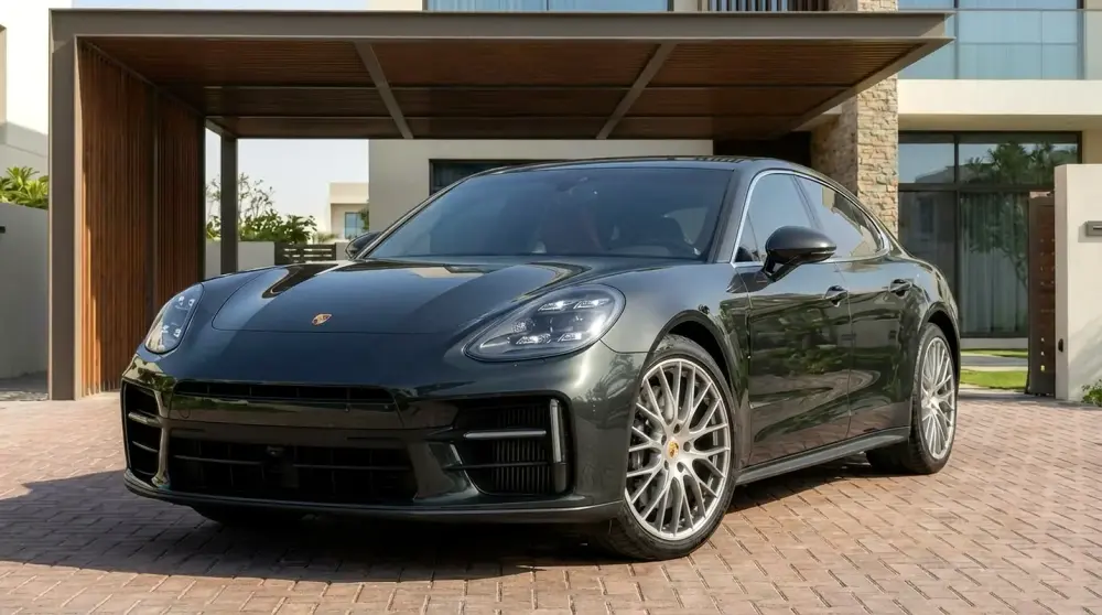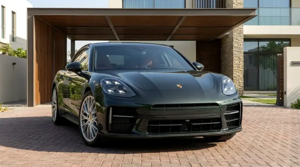 2025 Porsche Panamera in near-new showroom condition with only 1,300 km. GCC specification vehicle finished in the elegant Aventurine Green Metallic exterior paired with a premium truffle brown leather interior.