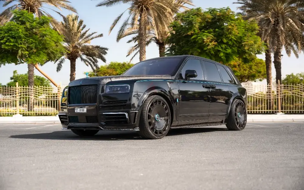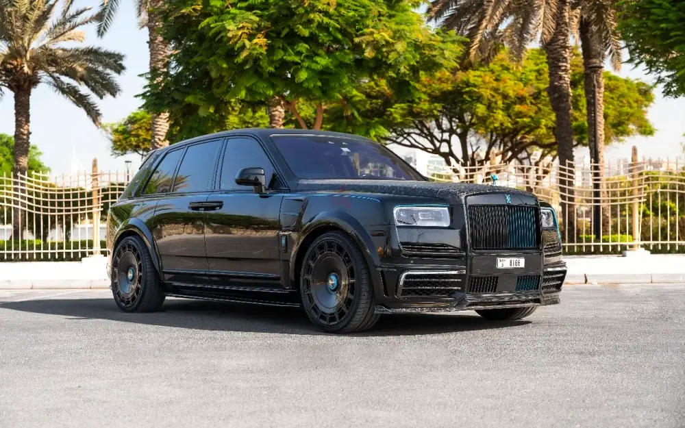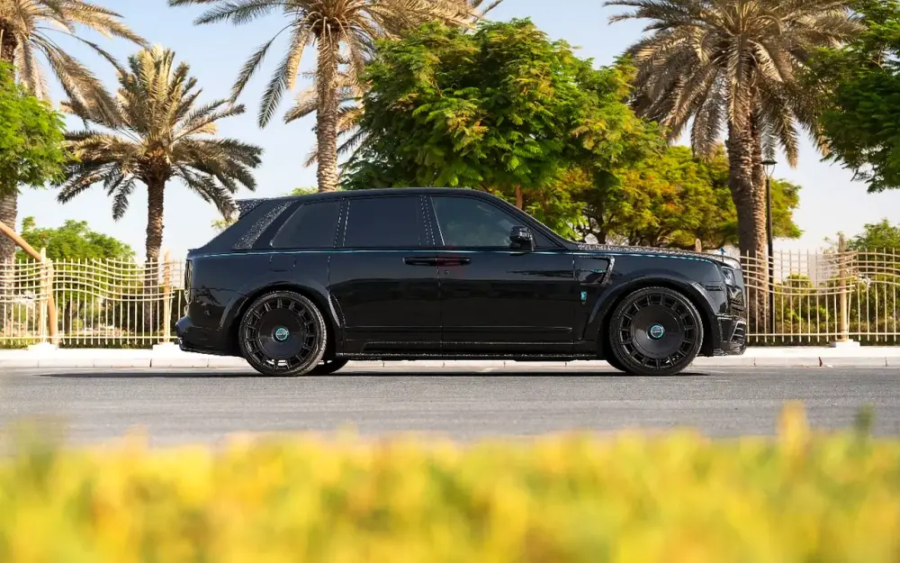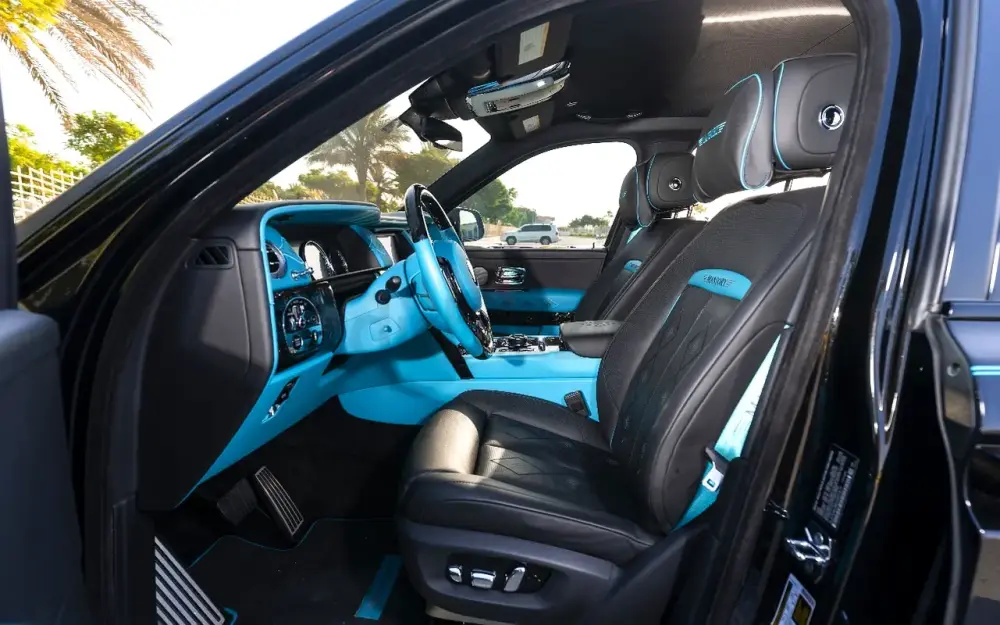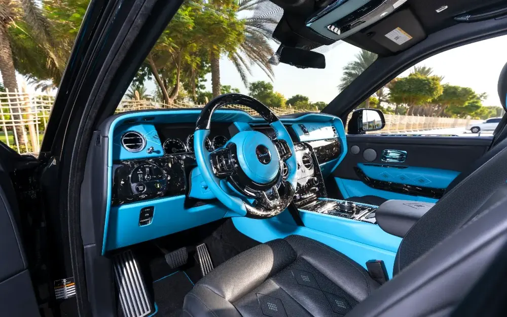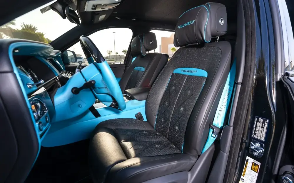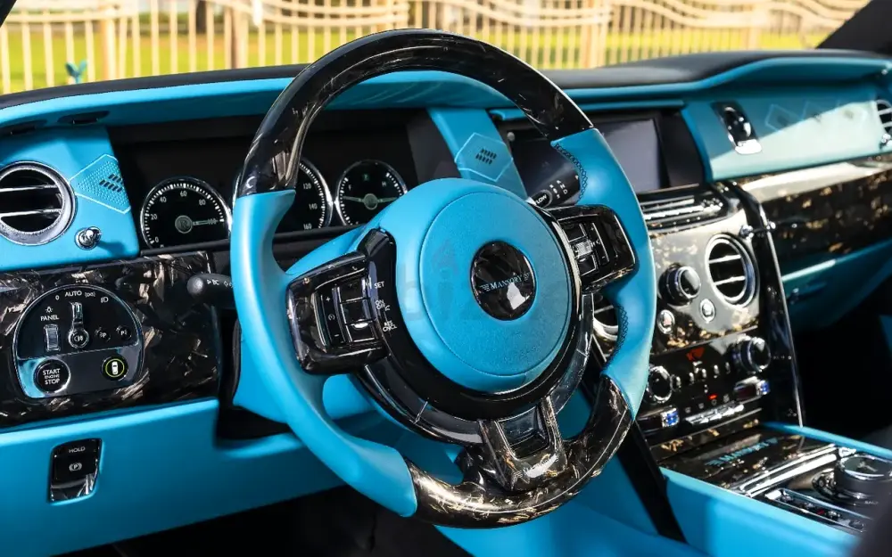 • Interior: High-quality two-tone leather in black and turquoise. The cabin includes forged carbon fiber details, a custom Mansory steering wheel, and the famous Rolls-Royce Starlight headliner.