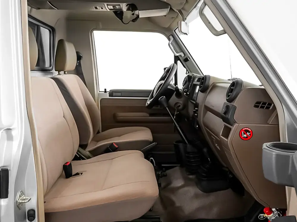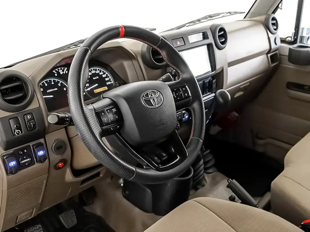 Crafted with practicality and comfort in mind, the Land Cruiser LX Pick-Up features a durable, yet comfortable cabin designed for both work and adventure. The interior is functional and spacious, offering excellent visibility and easy-to-use controls. Its modern infotainment setup, air conditioning, and smart storage solutions make every journey convenient and enjoyable, whether on-site or on the open road.
